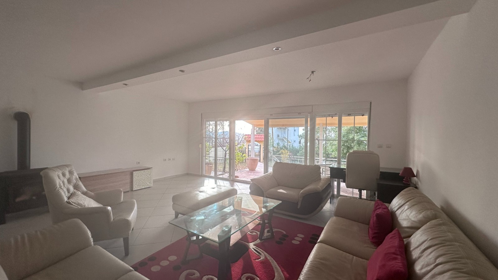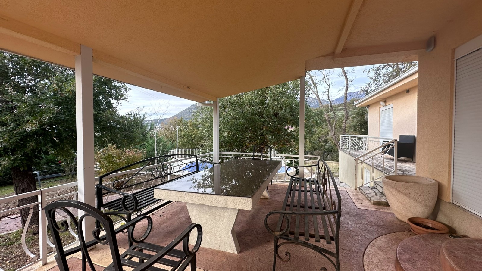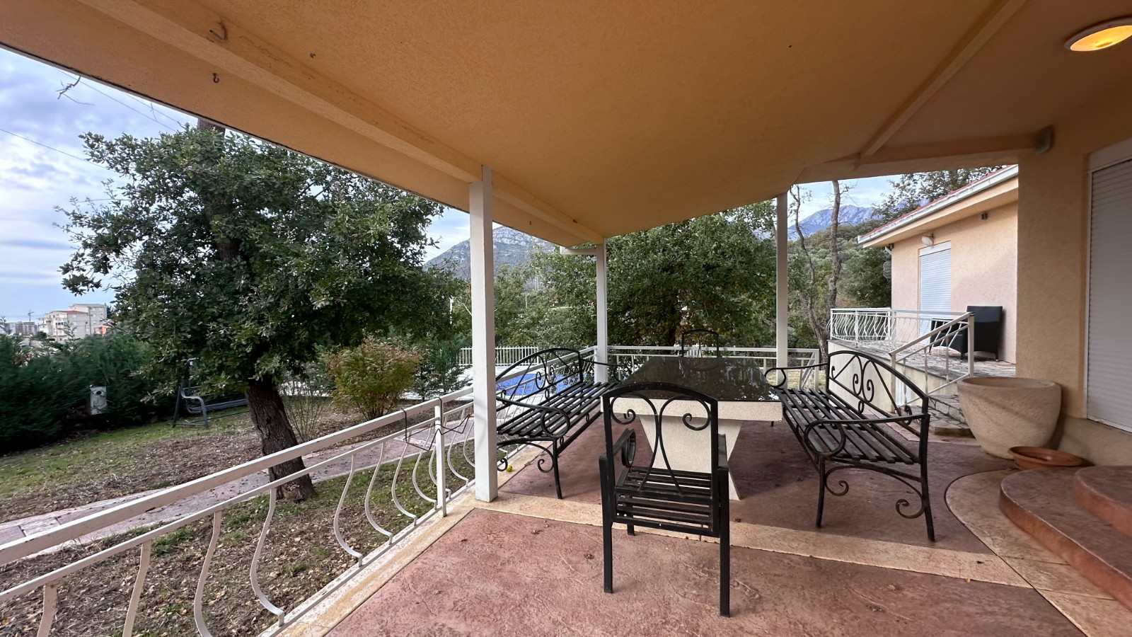 Kuća ima dva ulaza, prelepu veliku verandu na koju se izlazi iz dnevnog boravka i master spavaće sobe. Dvorište je ograđeno i veoma prostrano sa velikim bazenom. Sastoji se iz velike kuhinje i trpeyarije, prostranog dnevnog boravka sa kaminom, 4 spavaće sobe – od kojih je jedna master sa vojim kupatilom- dva kupatila i gostinskog toaleta. Na placu je smeštena i pomoćna kućica površine oko 35m2 koja se sastoji iz jedne sobe i kupatila.