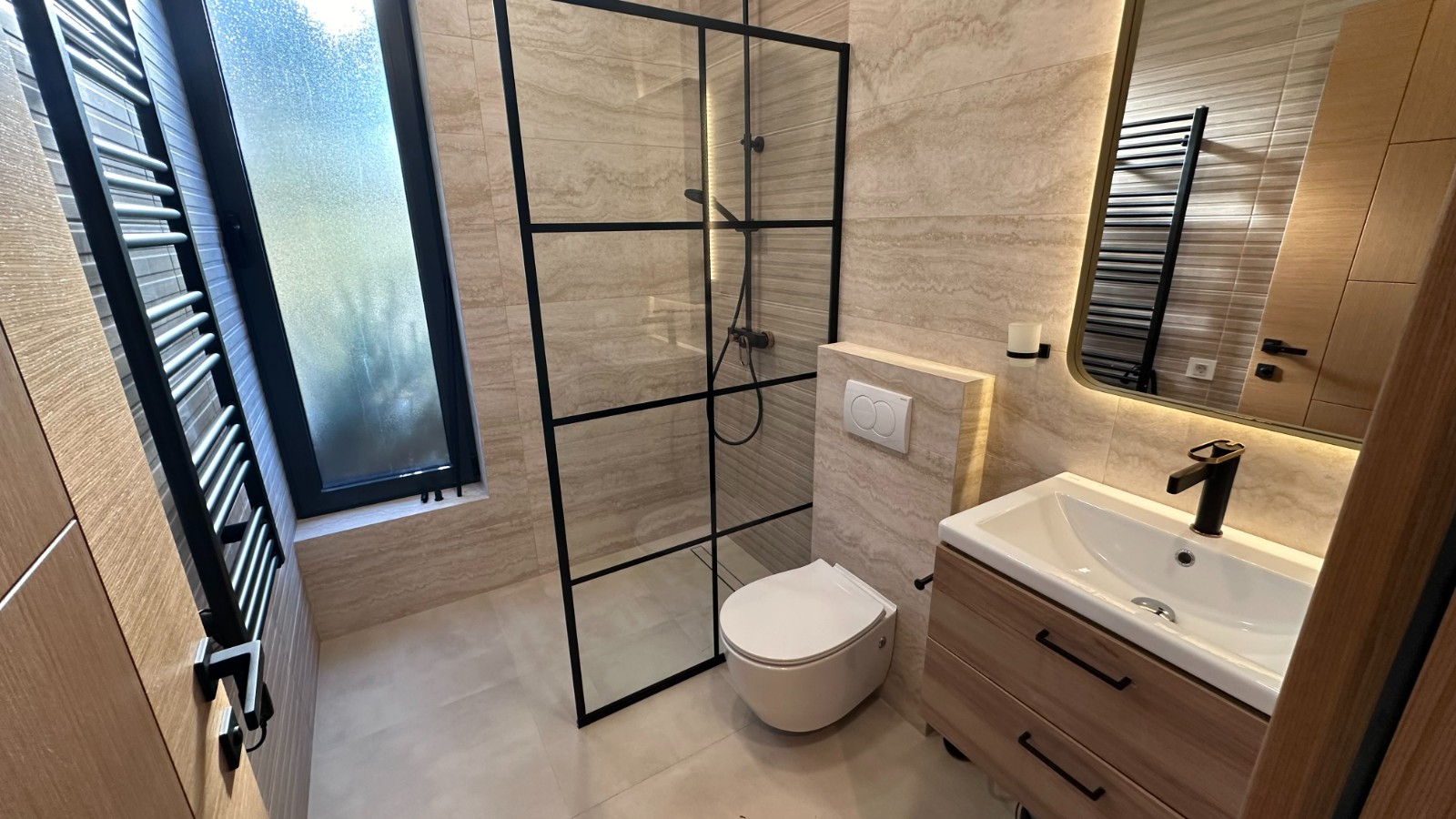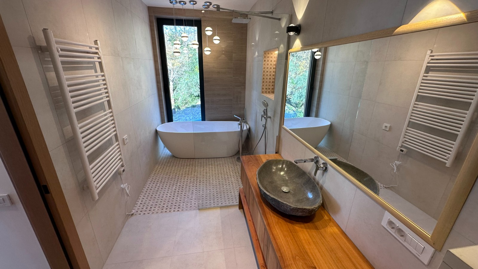 U suterenu je smještena velika tehnička soba sa toplotnim pumpama i jos dvije velike prostorije koje se mogu urediti po želji kupca.