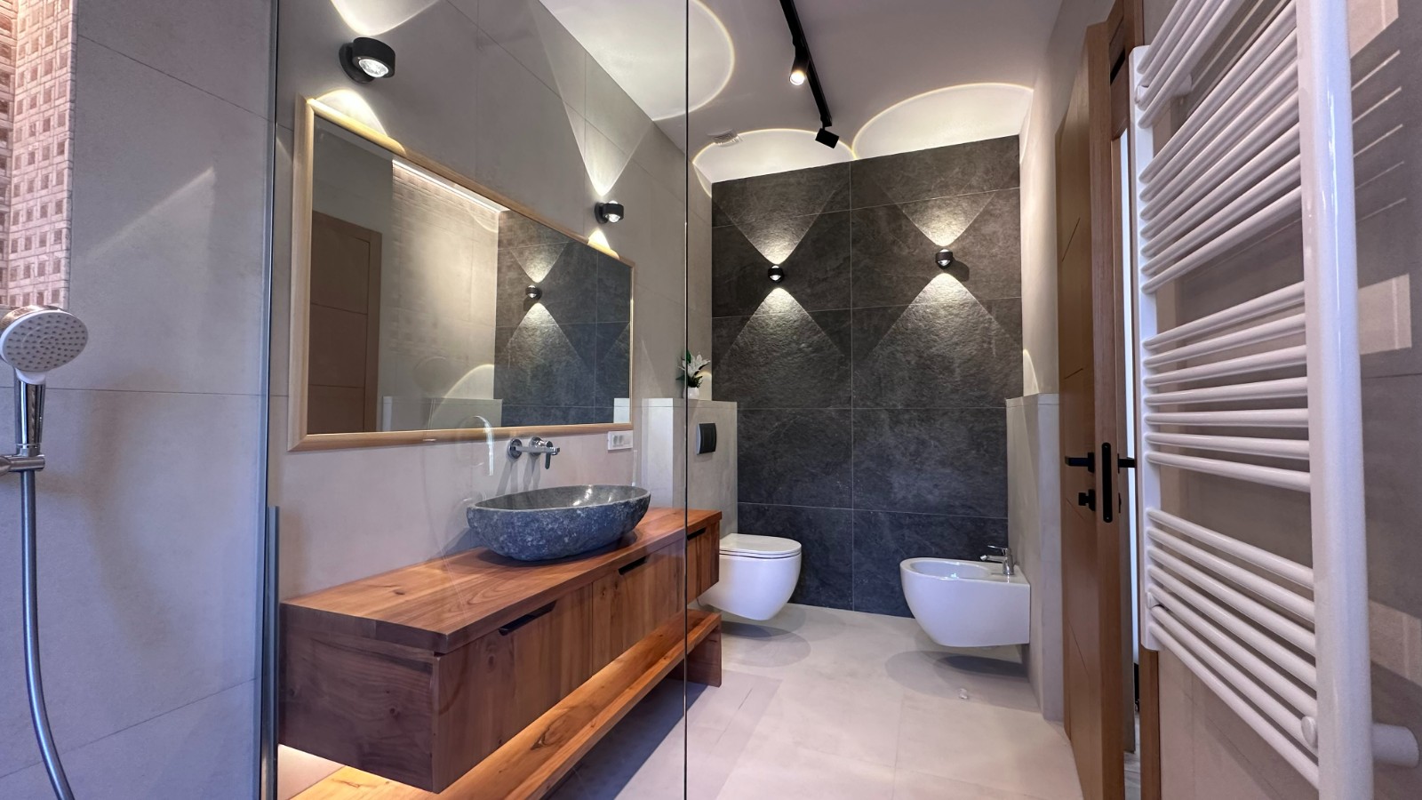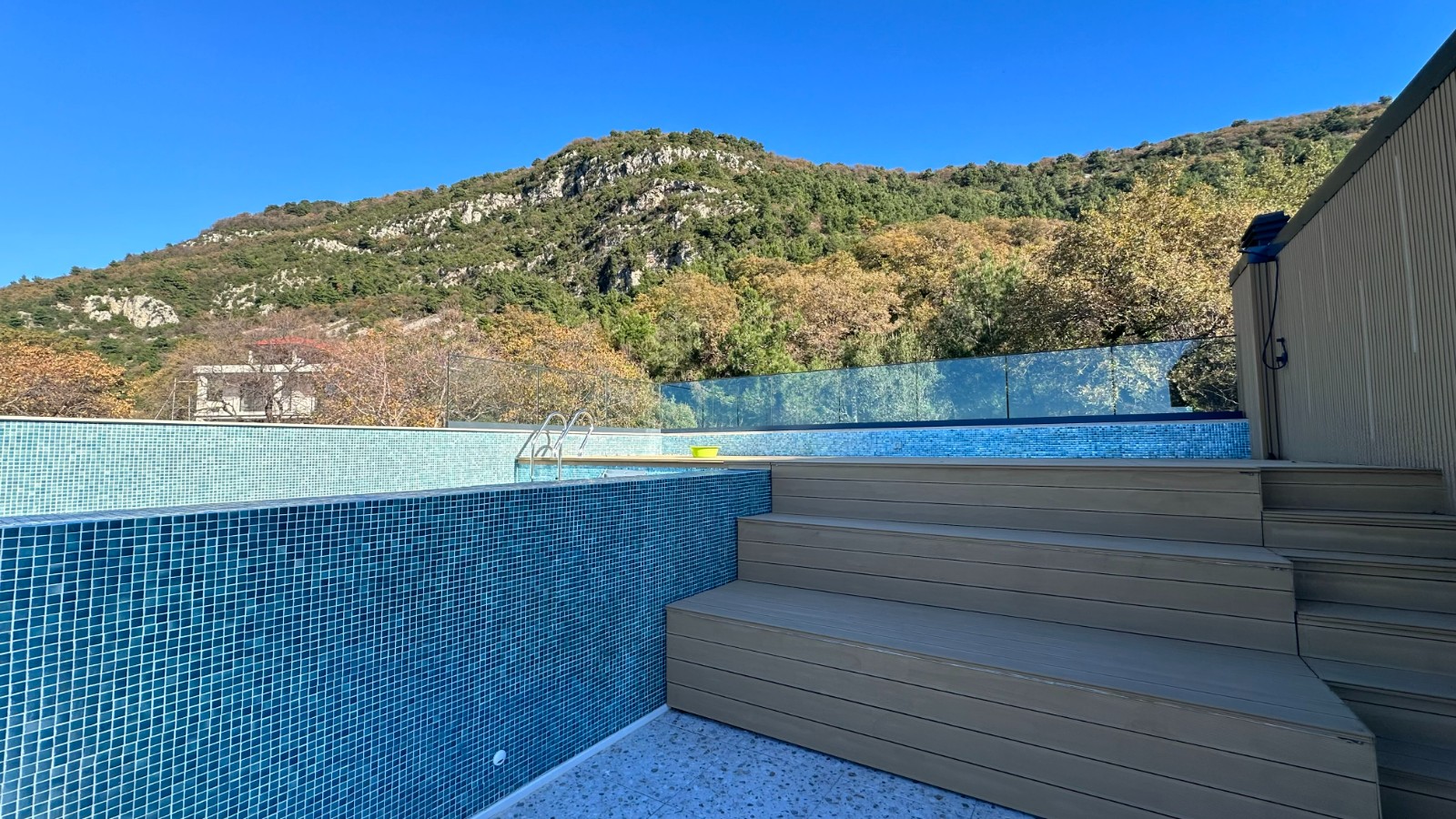 Objekat se proteže na tri nivoa plus krovna terasa sa bazenom i sunčalištem, vanjskim tušem i gril zonom.
