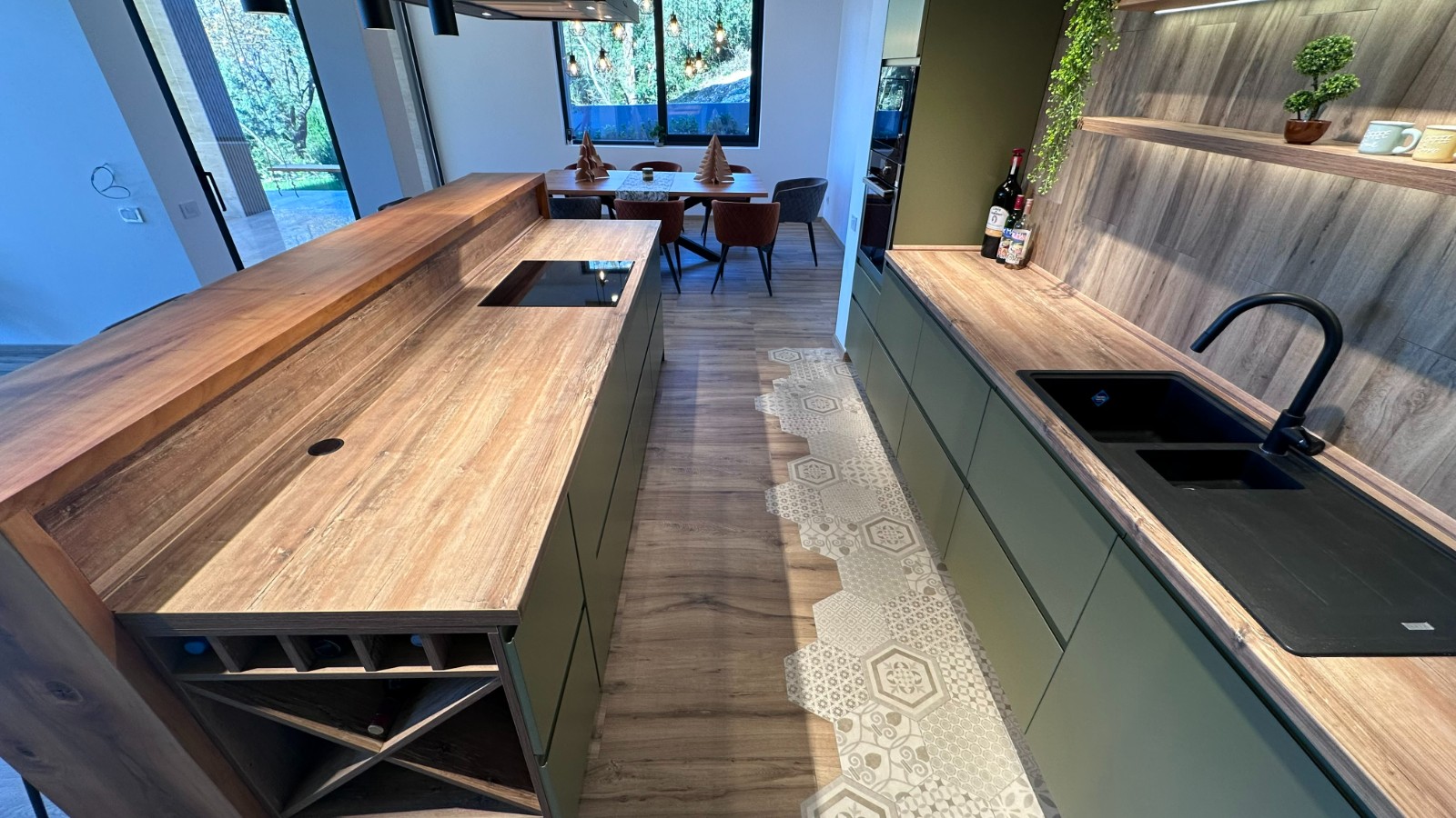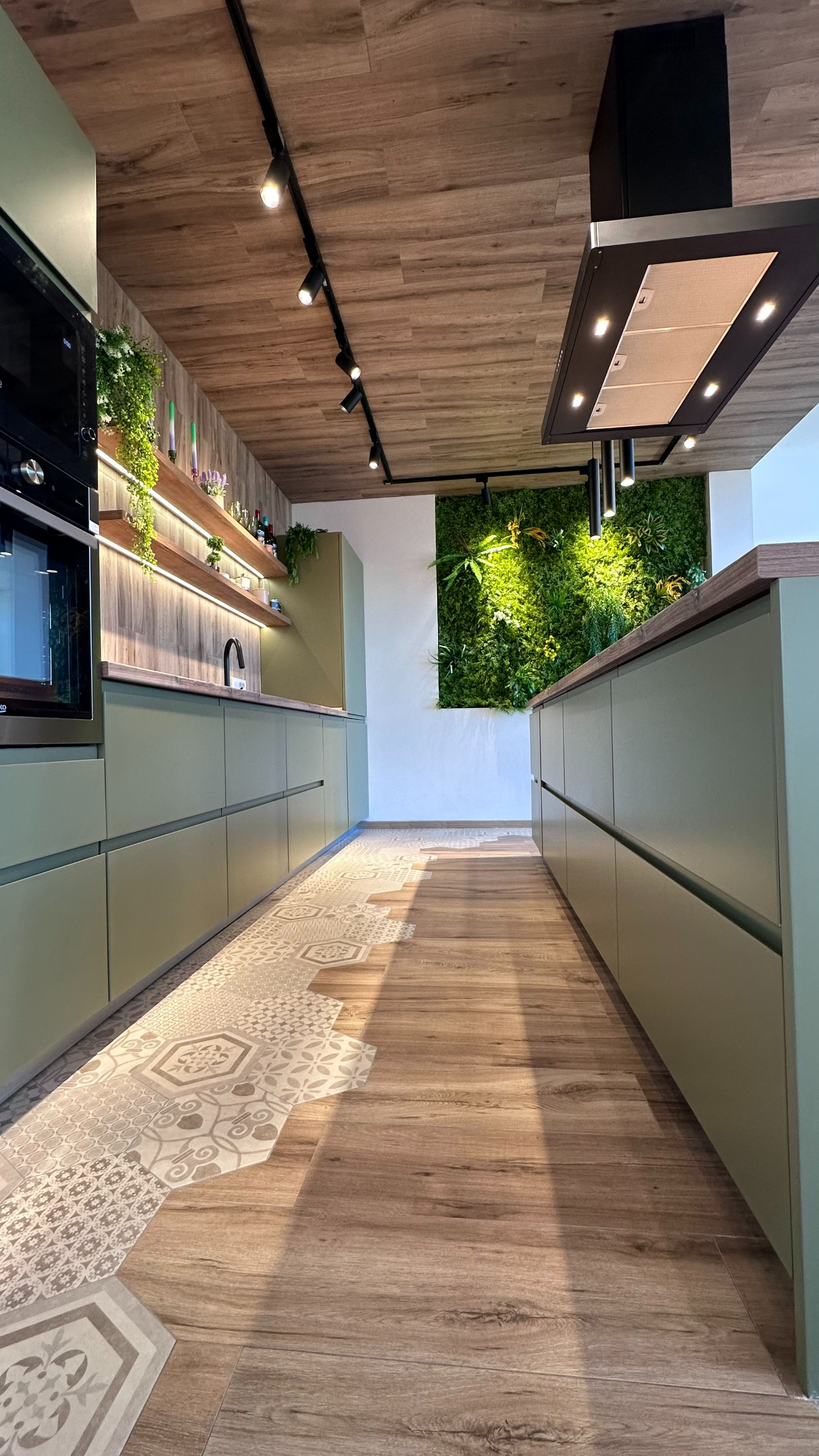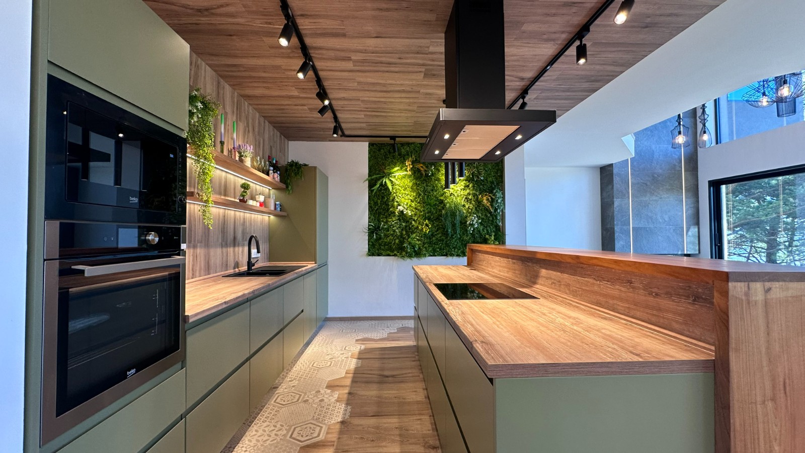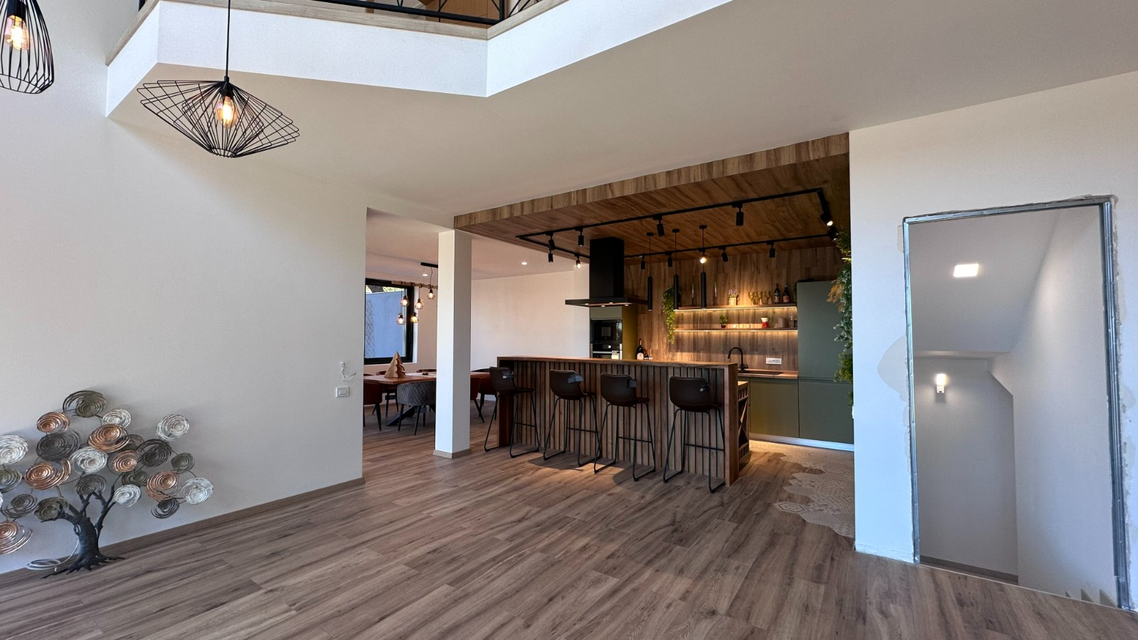 Prizemlje se sastoji iz predsoblja, garderobera, vešernice, gostinskog toaleta, velikog dnevnog boravka sa kuhinjsko trpezarijskim djelom. Visina ovog prostora je 6m, velike klizne panoramske staklene površine imaju zaštitu od sunčevih zraka a istovremeno obezbeđuju obilje svjetlosti.