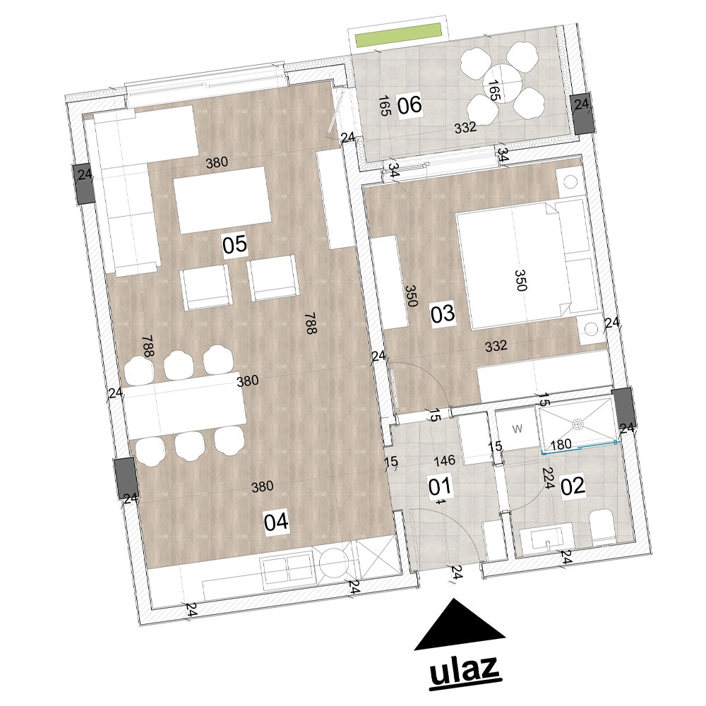 Stan koji nudimo se sastoji iz predsoblja, dnevnog boravka sa kuhinjsko trpezarijskim djelom, spavaće sobe, kupatila i terase.