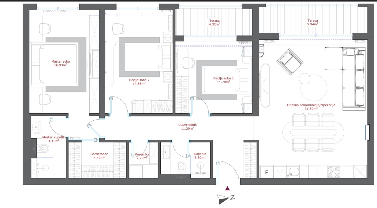 Stan se sastoji iz predsoblja, open space dnevnog prostora sa trpezarijskim djelom i kuhinjom, tri spavaće sobe (od kojih je jedna master sa svojim kupatilom i garderoberom), dva kupatila, vešernice i dvije terase.