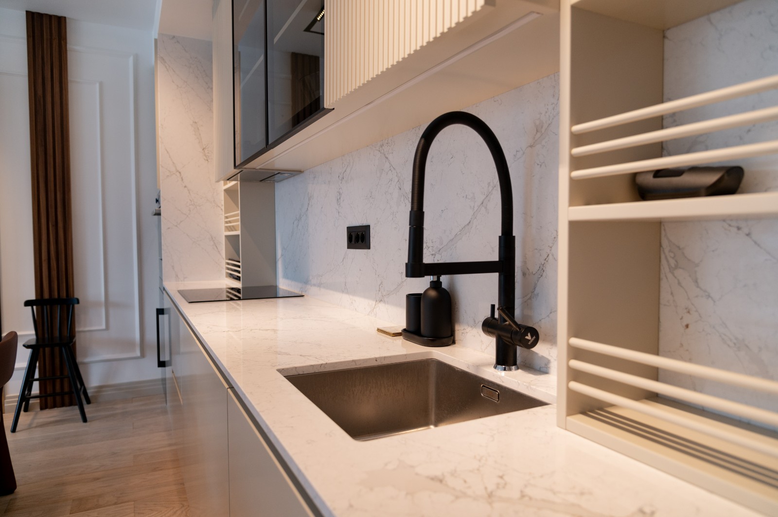 U stanu je sve urađeno od najkvalitetnijih materijala – keramike, sanitarija, stolarskih radova. Kuhinja je kompletno opremljena vrhunskom bijelom tehnikom. Dizajniran do detalja. Sa terasa se pruža prelijep pogled na rijeku.