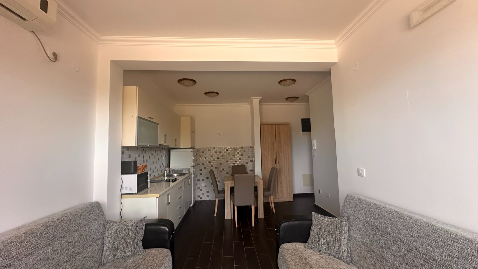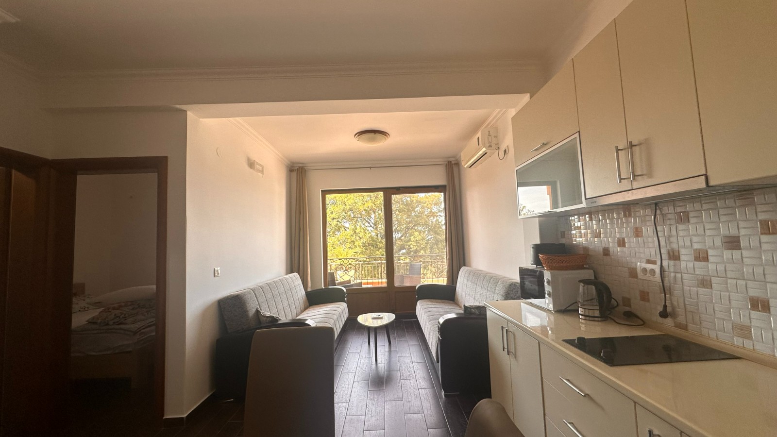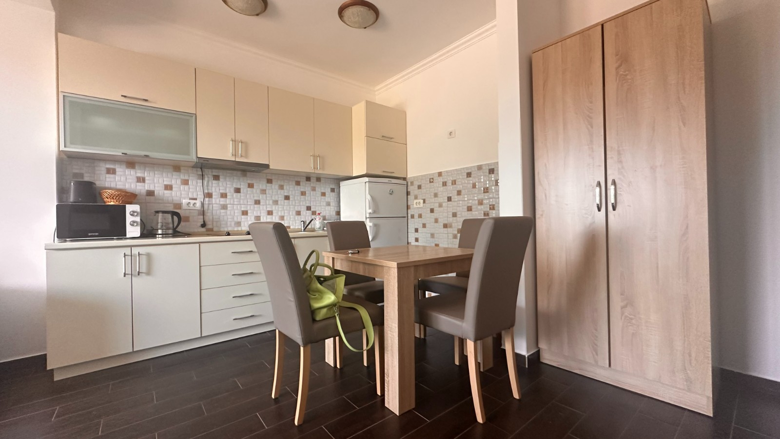 Sastoji se iz predsoblja, dnevnog boravka sa kuhinjom, spavaće sobe, kupatila i terase. Namješten i opremljen i odmah useljiv.